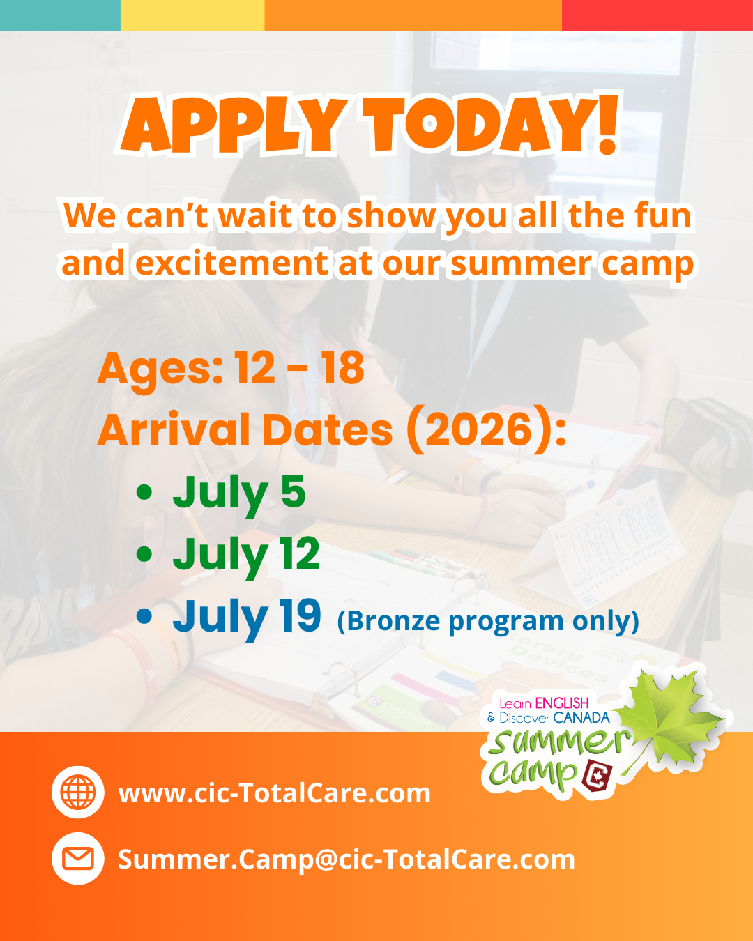 Everything is covered by our Total Care system—so you just focus on having the best summer of your life.It’s more than a camp; it’s your first step toward the world. Spaces are limited—don’t miss out!
