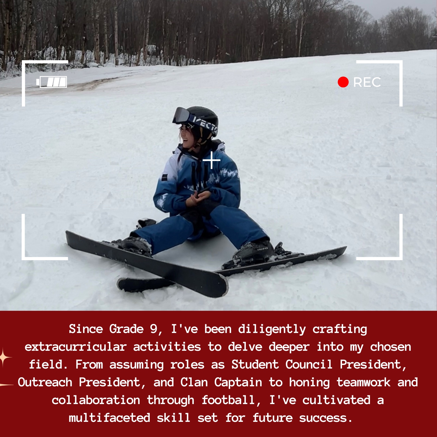 Từ hồi lớp 9, em đã luôn cố gắng tham gia các hoạt động ngoại khóa để có thêm kiến thức về ngành học yêu thích. Cụ thể là đảm nhiệm các vị trí như Chủ Tịch Hội Đồng Học Sinh, Chủ tịch Tiếp Cận Cộng Đồng, và Đội Trưởng Thị Tộc. Tất cả những công việc đó đã giúp em trao dồi khả năng làm việc nhóm và biết hợp tác với đồng đội, em thực sự muốn có cho mình những bộ kỹ năng đa chiều tạo điều kiện thuận lợi cho thành công trong tương lai. Tham gia các kì thực tập trong các đợt nghỉ hè càng củng cố hoài bão nghề nghiệp của em, mang lại cho em những hiểu biết sâu sắc vô giá về đời sống thực tế của một nhà nghiên cứu y học.