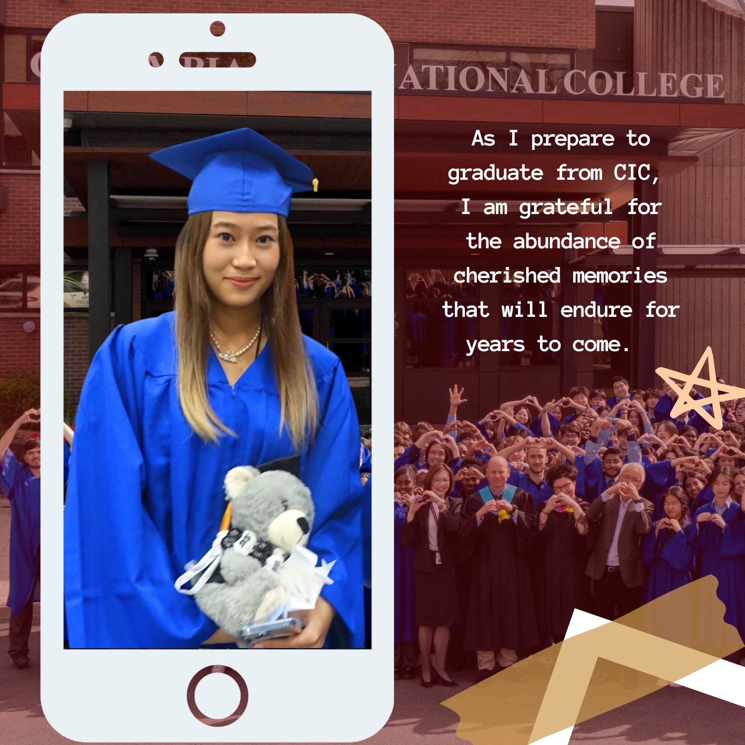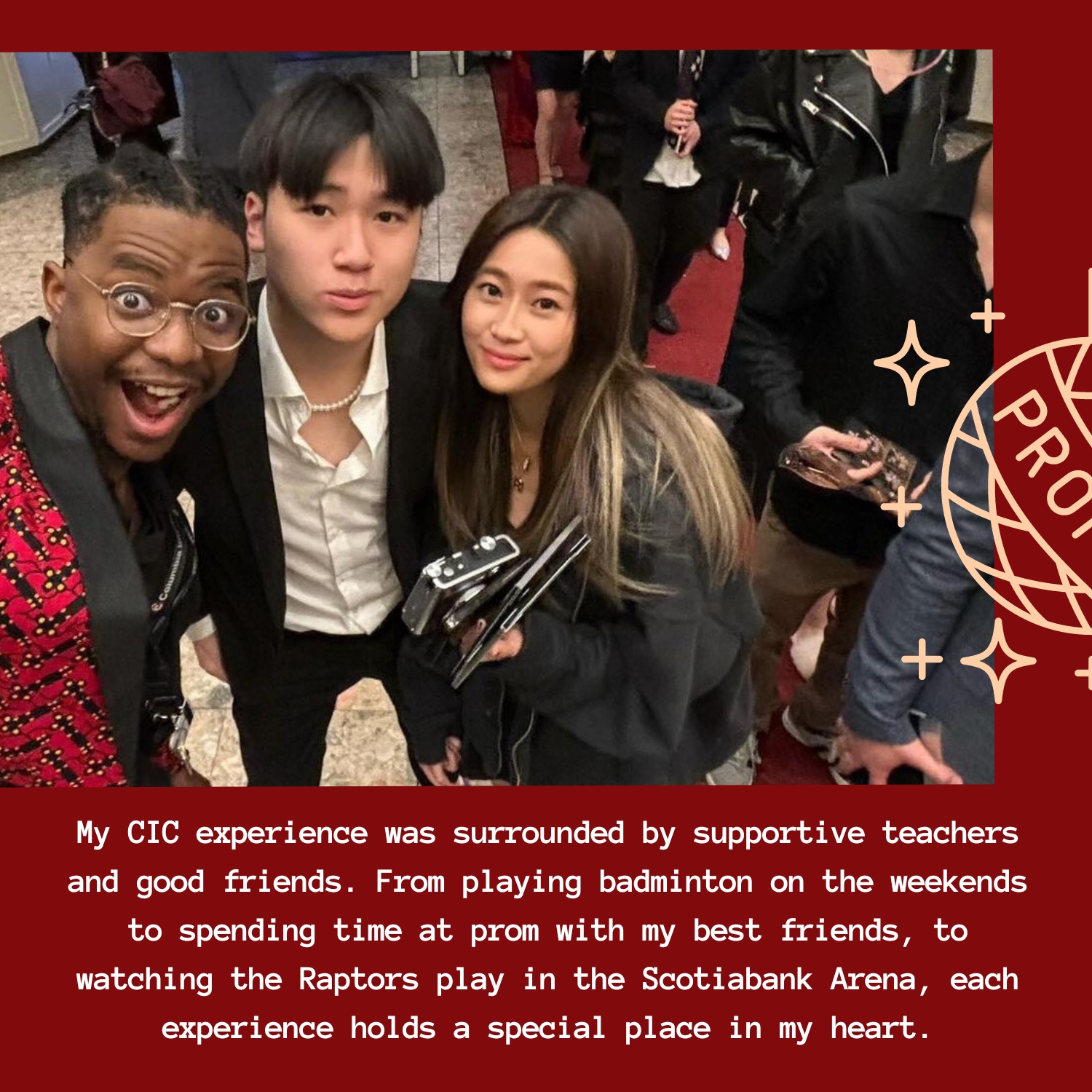 Những năm tháng của em tại CIC luôn có những người bạn tốt và những giáo viên tuyệt vời luôn hết mình hỗ trợ. Từ việc chơi cầu lông vào cuối tuần đến tham dự Prom với bạn thân, rồi đi xem Raptors thi đấu ở Scotiabank Arena, mỗi trải nghiệm đều giữ một vị trí đặc biệt trong trái tim em.