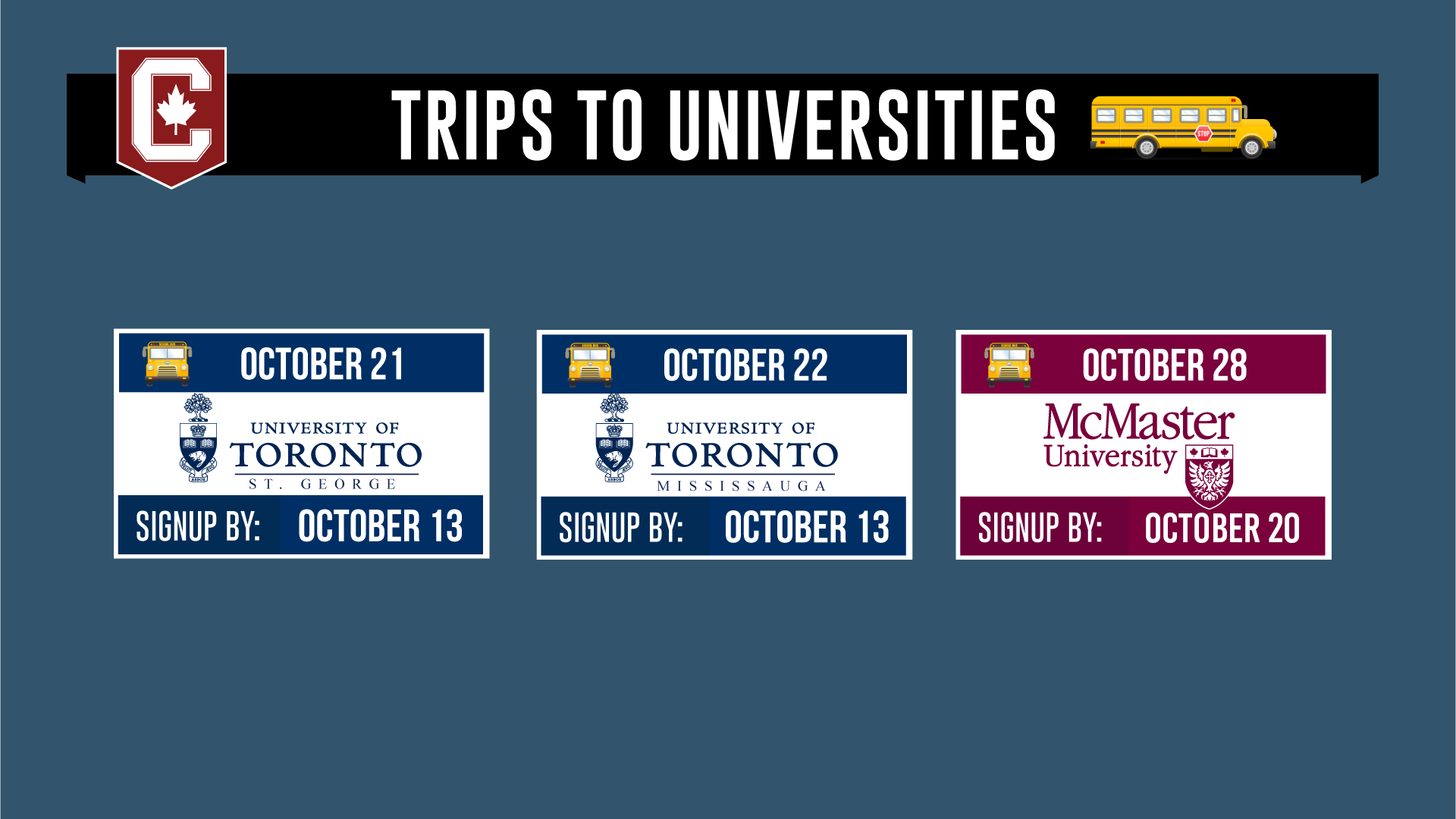 作為加拿大畢業生人數最多的私立中學,哥倫比亞國際學院(CIC)與一流大學保持十分緊密的招生合作與交流,包括大學申請輔導辦公室(UPO)每年多次組織的安省大學參觀活動。在資深的大學申請輔導老師陪同下,走入心儀大學的校園,體驗最真實的學習生活感受,獲得你最渴望了解的一手資訊: 實地了解大學環境、專業設置與學生服務; 與大學教師、職員、在校生面對面交流,答疑解惑; 熟悉申請程序、獎學金設置、宿舍等入學相關情況。 2017年秋季學期的大學參觀本周末即將開始,祝大家旅途愉快,“遊”有所成: 10月21日(周六) 多倫多大學主校區 U of Toronto (St. George) 10月22日(周日) 多倫多大學密西沙加校區U of Toronto (Mississauga) 10月28日(周六) 麥克馬斯特大學 McMaster University 11月4日(周六)滑鐵盧大學 University of Waterloo 11月4日(周六)約克大學 York University 11月5日(周日)布魯克大學 Brock University 11月12日(周日)韋士敦大學 Western University 11月18日 (周六)多倫多大學士嘉堡校區 U of Toronto (Scarborough) 報名程序:在College Store報名,繳費$10。憑收據來UPO登記,並領取出發時間與參觀規則等詳細信息。